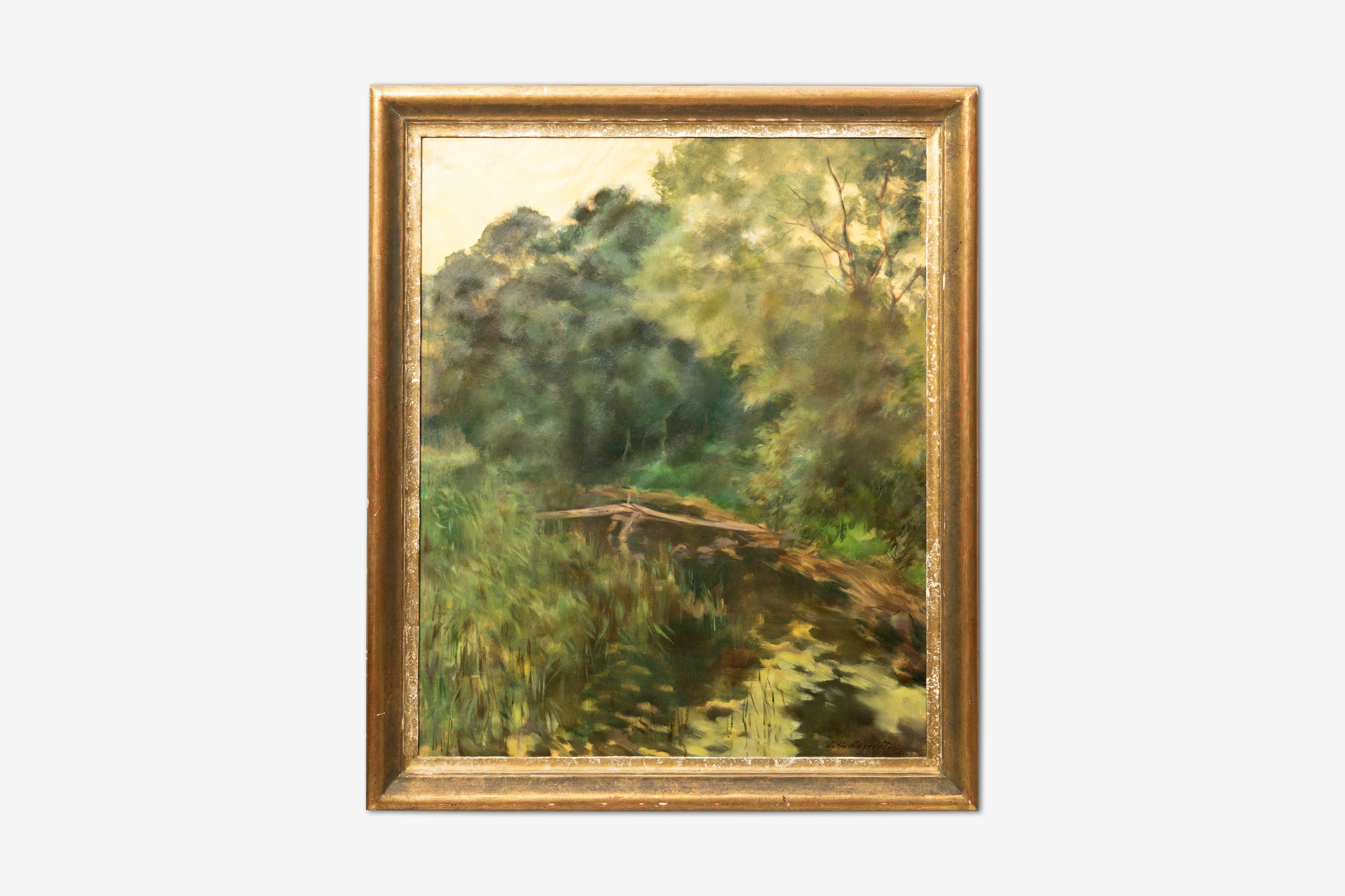 Lotte Laserstein was one of the most important figurative painters of the Weimar Republic. As one of the first women to graduate with honours from the Berlin Academy in the 1920s, she developed a precise, naturalistic style that masterfully combines portraiture, psychological depth, and the modern type of the “New Woman.” Her works are considered highlights of the representational painting of her era. The oil painting presented here shows a quiet, nature-loving scene: a pond framed by trees, a narrow footbridge, soft light over a still surface of water. Laserstein combines clarity and melancholy to create a harmonious, atmospheric image of nature.