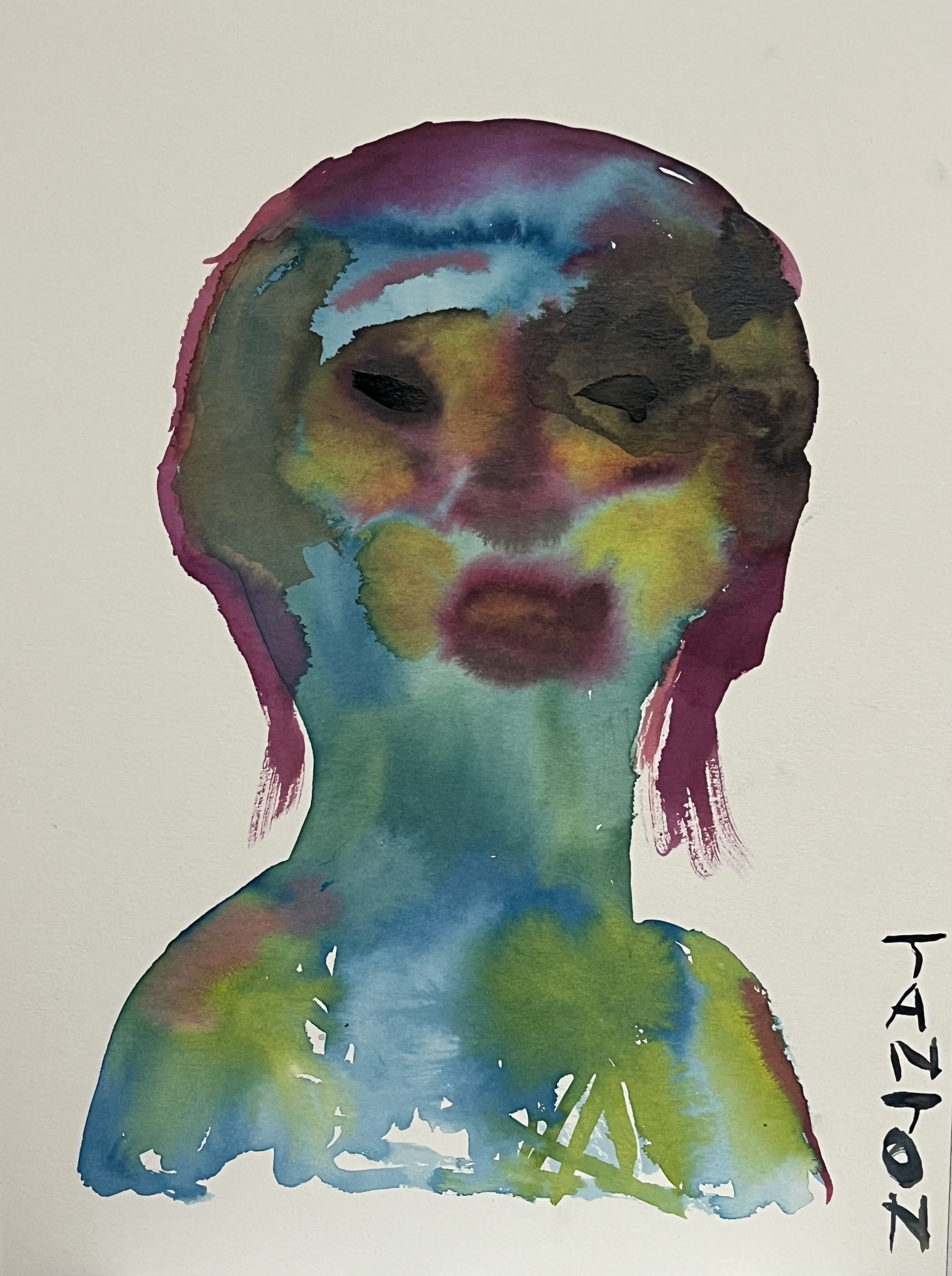 Nikolai Tanton is one of the quiet protagonists of a young art scene characterized by contemplative depth and sensitively modulated colour worlds. With his exhibition “Last Days in Paradise,” he presented a group of works at Munich’s Kunstraum Weltraum in 2026 in which graphic precision meets atmospheric density. A characteristic of his working method is glazed layers of colour that suggest emotions rather than express them. The watercolour presented here is composed in a flat manner and kept in dark, earthy tones. The figure appears en face, at once enigmatic and emotionally charged. The transparent, heavy-looking fields of colour create a quiet, emotionally dense image that is memorable less for its realistic detail than for its psychological presence.