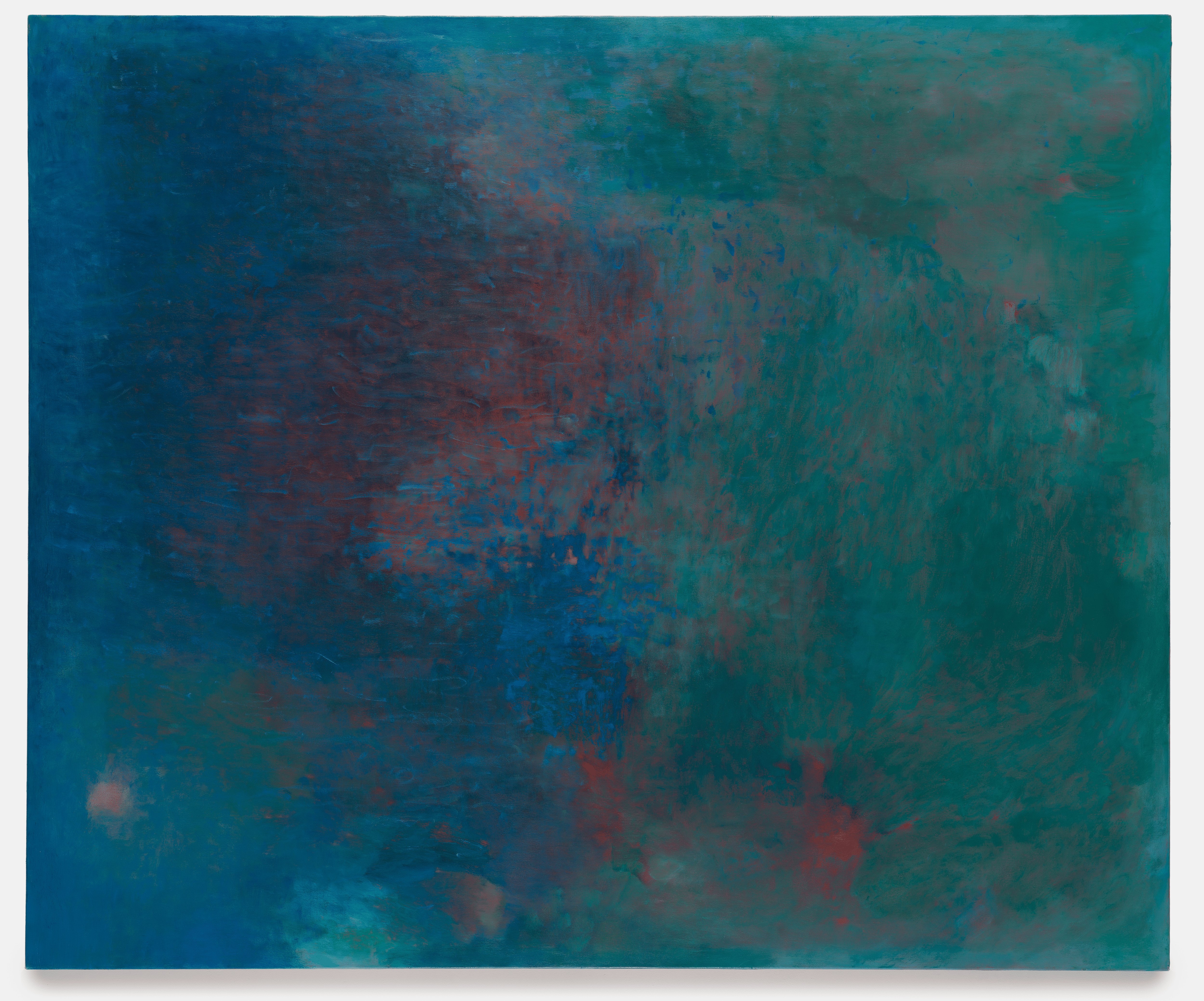 Richard Kellett, born 1982 in England, is an emerging artist whose masterly use of colour and command of gesture combine in his provocatively beautiful oil paintings. The first of a series in progress, “Untitled”, 2025, could almost be a theatre for spring, a green romance played out on a large linen stage. The canvas is a reawakening land, where celestial light fuels and illuminates nature’s performance. Opaque colours dash across the surface, in places tumbling over each other in a tussle for space. Translucent pigments almost disappear in areas of shade, while the red earth background, which is visible in parts, suggests some of this season’s cast are yet to arrive.