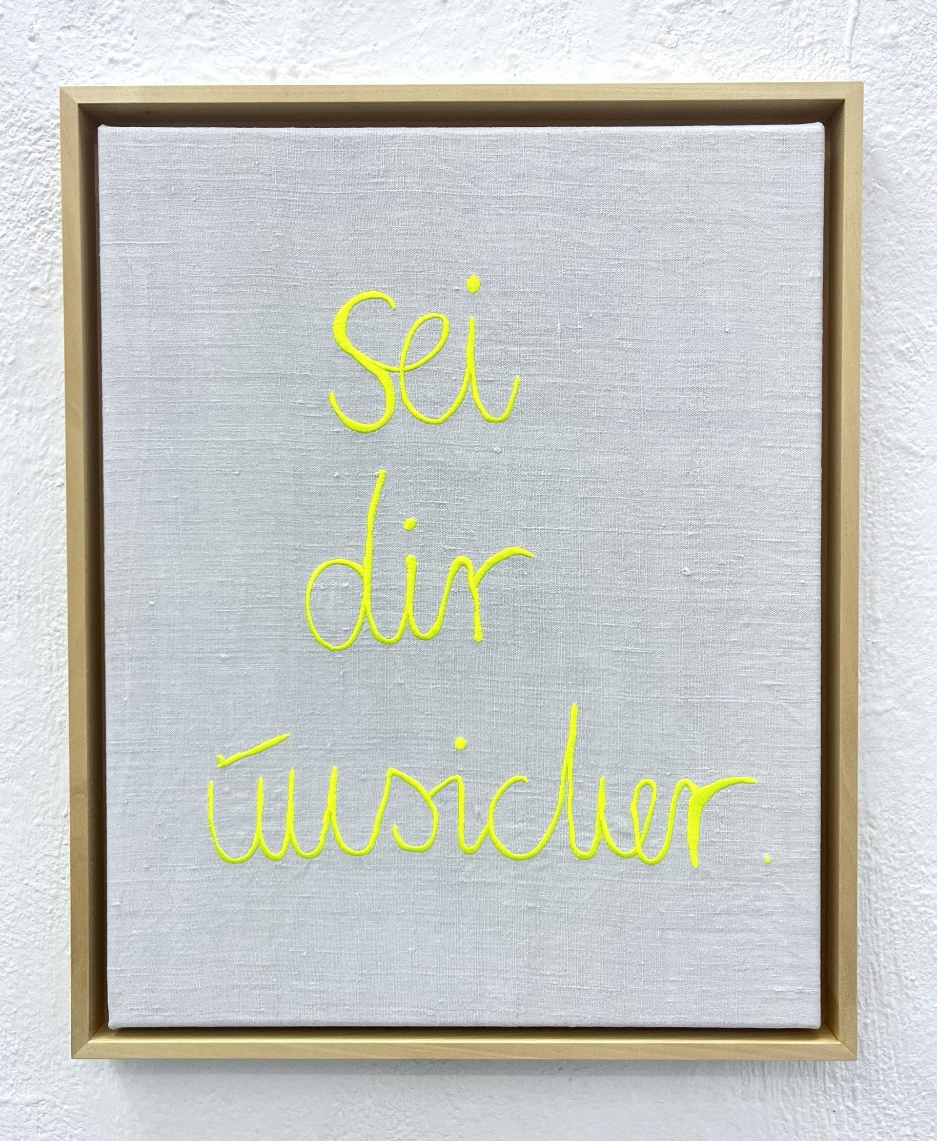 Thea Altmann combines painting, textile art, and typography to create a distinctive visual language. After years in costume and fashion design and studying art, she developed a poetic, material-conscious practice that transfers textile techniques into the context of contemporary art. Her works range from large-format canvases to textile mixed media pieces. The embroidery shown here is part of a series of textile word images in which Altmann inscribes short sentences into the material as concentrated moments of doubt and questioning. The embroidered sentence is condensed onto cotton into a fragile yet decisive gesture. The handiwork remains visible: unevenness, threads, texture—everything becomes part of a statement that does not negate self-doubt, but rather honours it as productive openness.