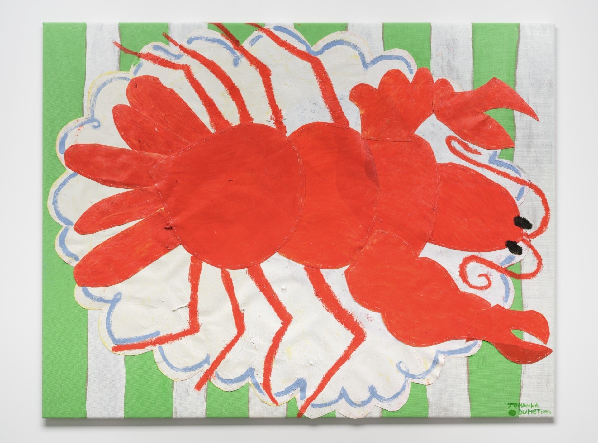 Johanna Dumet, born in Guéret, France, in 1991, is considered an up-and-coming figure in contemporary painting. After studying applied arts and fashion design, she devoted herself entirely to the visual arts and now lives in Berlin. Her works combine traditional techniques such as oil, oil pastels, and charcoal sketches with bold colours, playful patterns, and an ironic examination of luxury and consumer aesthetics. The work presented here brings together Dumet’s characteristic style: opulent forms, bright areas of colour, and a subtle interplay between figuration and abstraction create a scene full of sensuality and subtle irony.