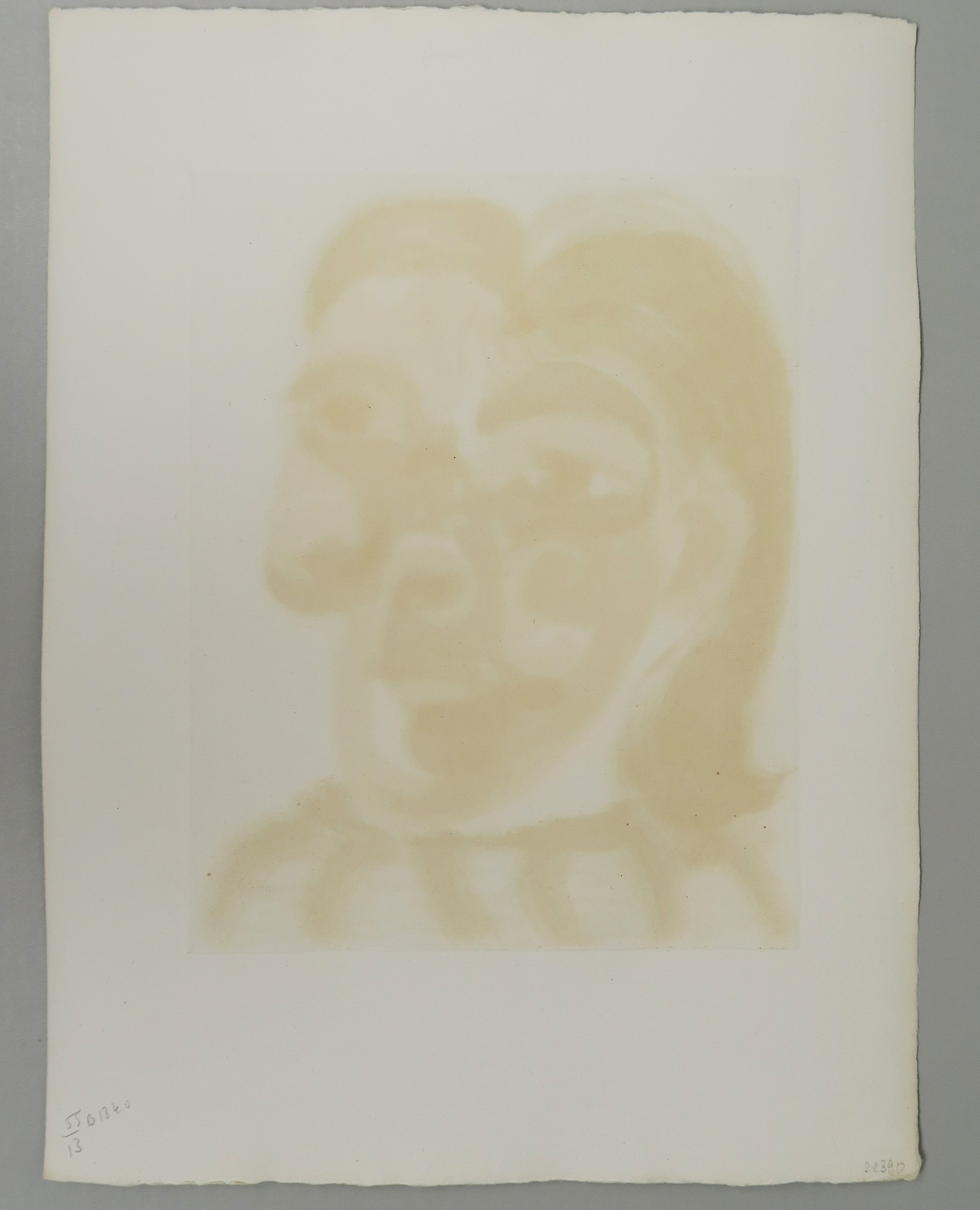 The print Tête de Femme No. 2, a portrait of Dora Maar (1907–1997), was made three years after Picasso and the photographer first met. Showing the subject’s face simultaneously from the front and in profile, it strikingly illustrates the way in which the artist experimented with different perspectives and fused them together. The work is a four-colour print, executed in drypoint and aquatint on four copper plates, separately inked in yellow, pink, red and blue.