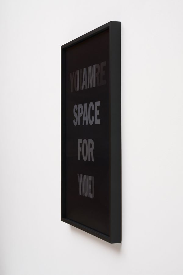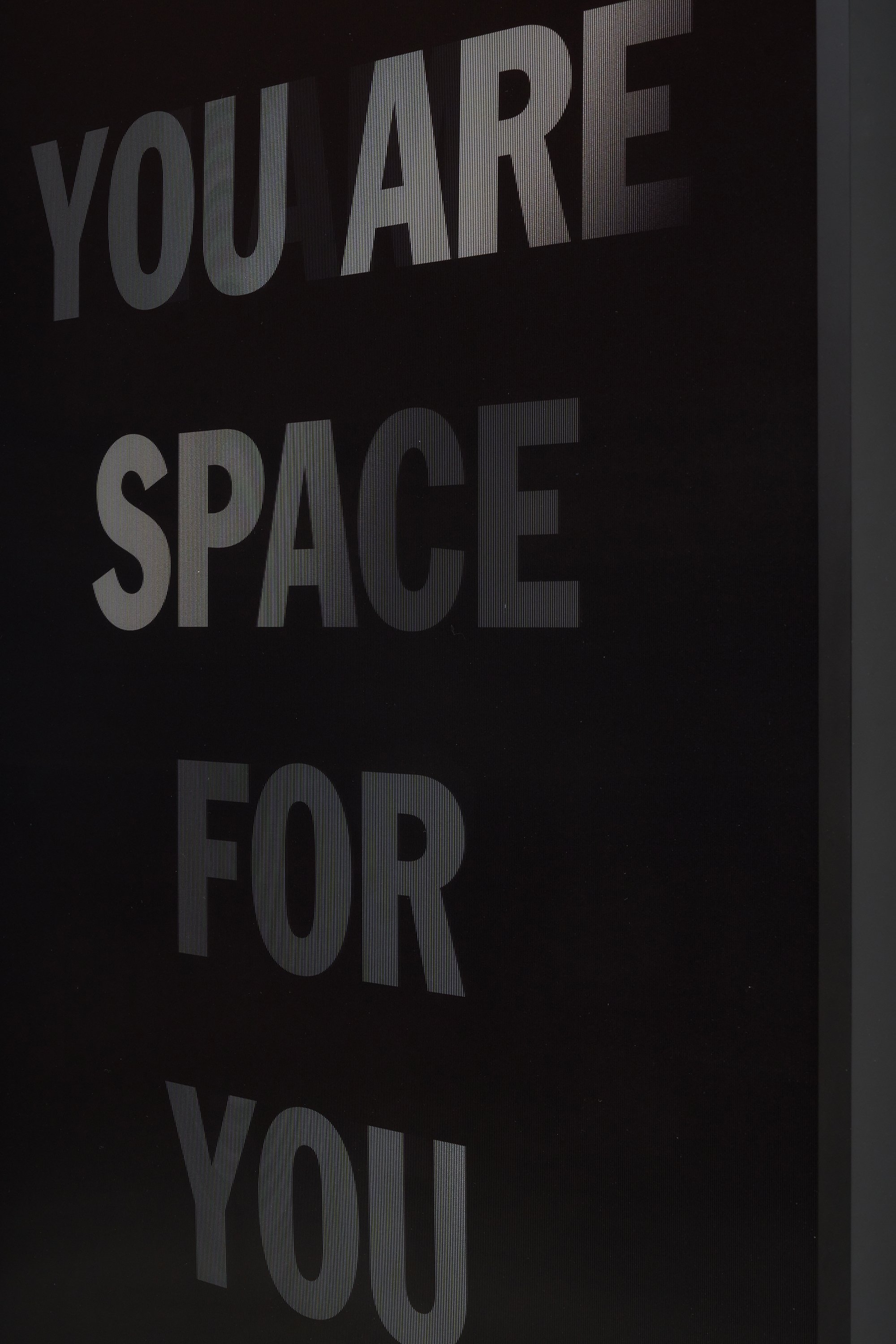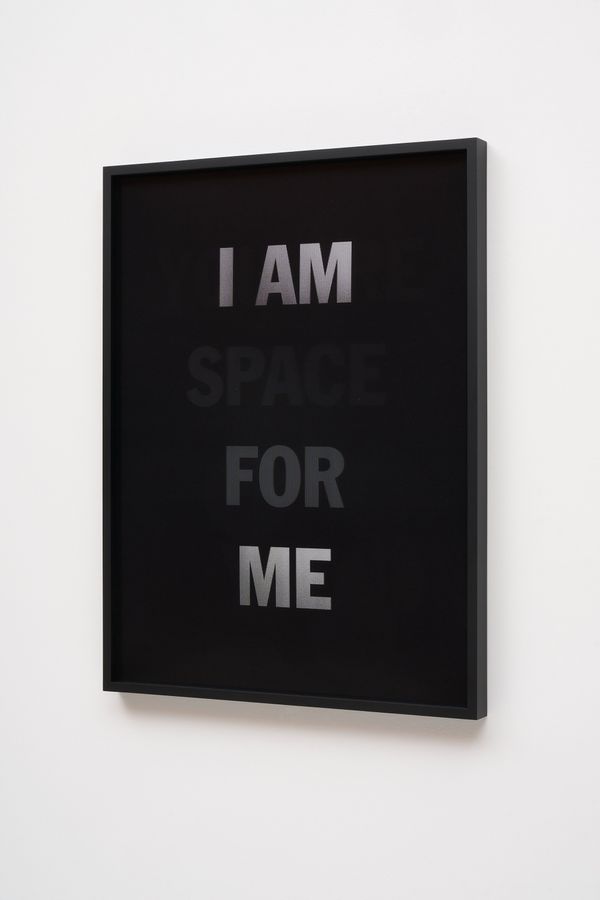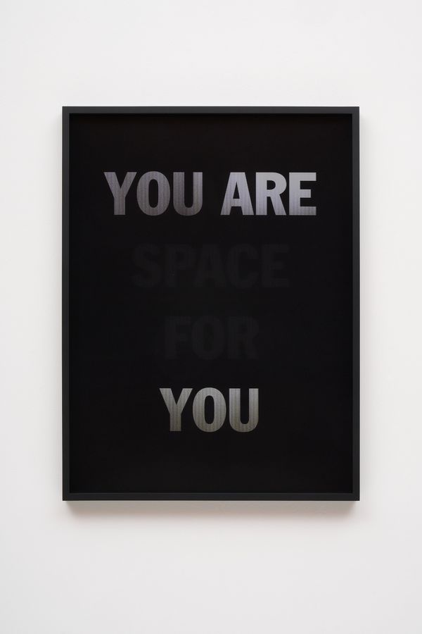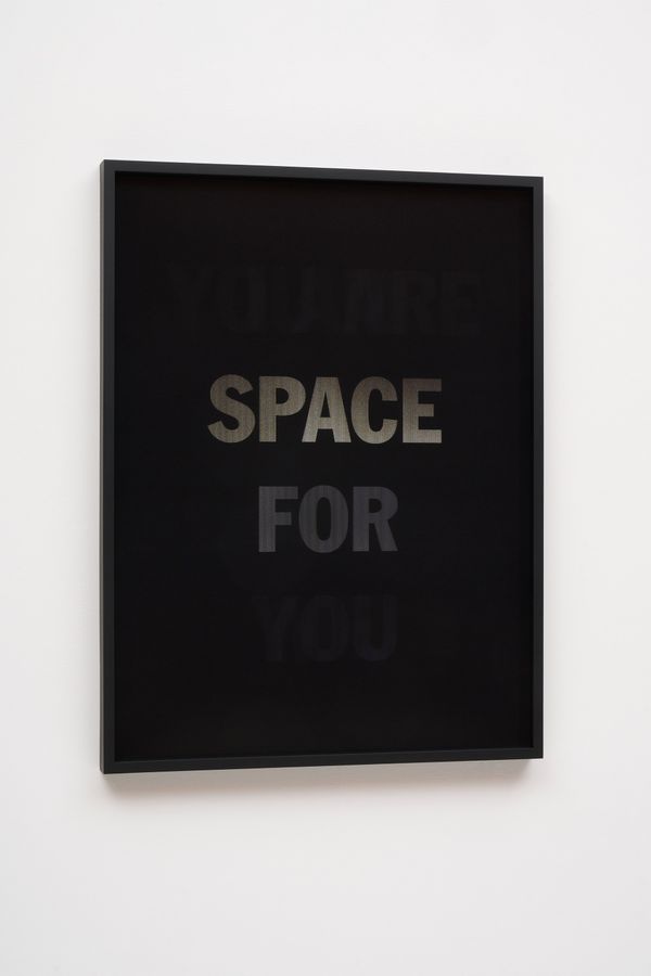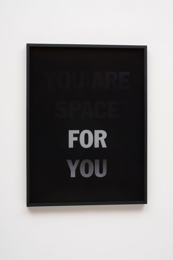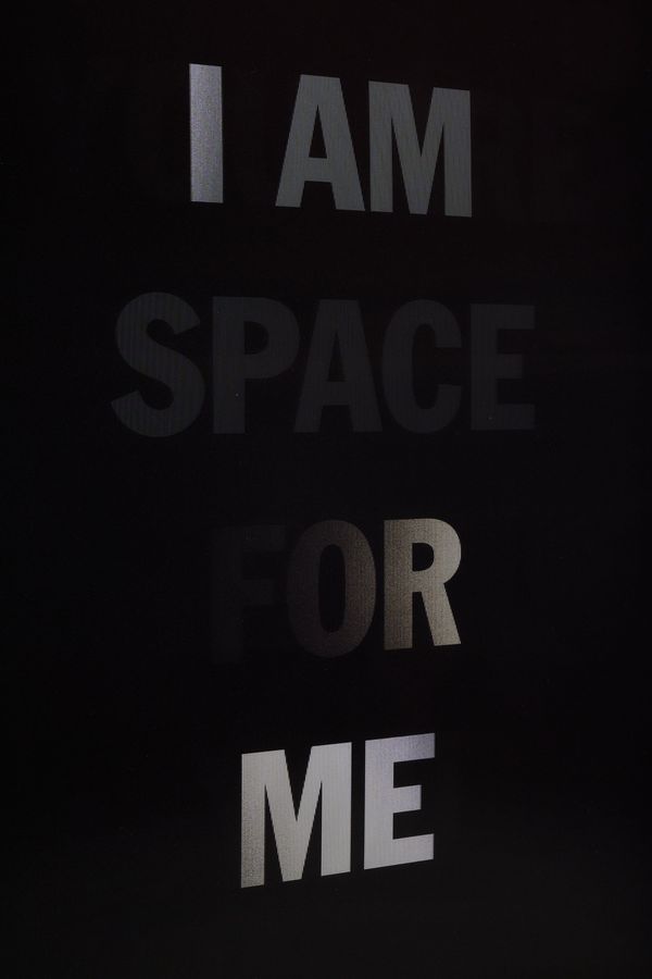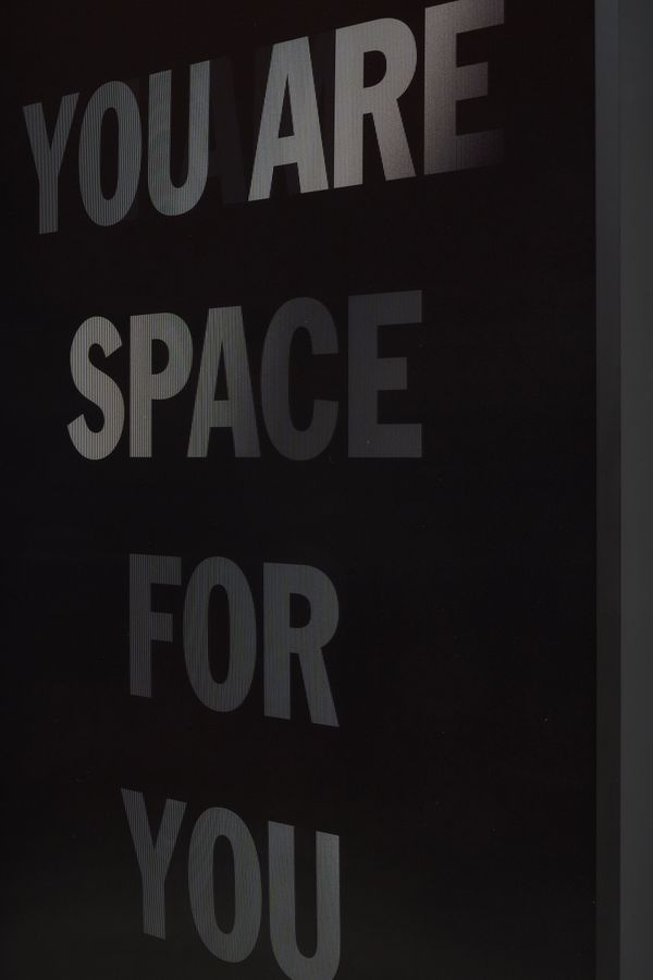 He incorporates text as a direct means of communication between himself and the viewer. The work is also expressed in monochrome. As the viewer passes in front of the material, the colour and the text move in gradients of black and white.