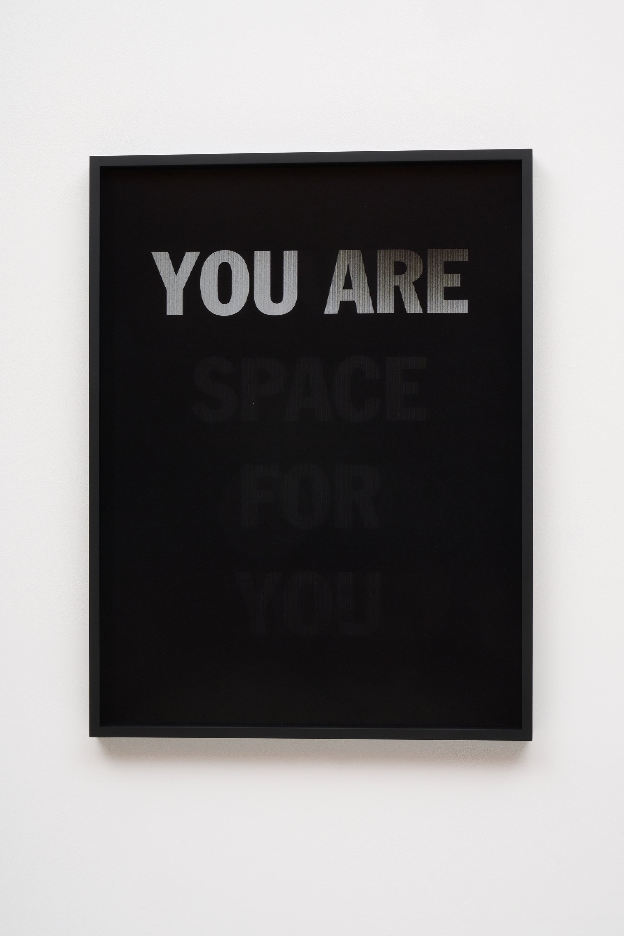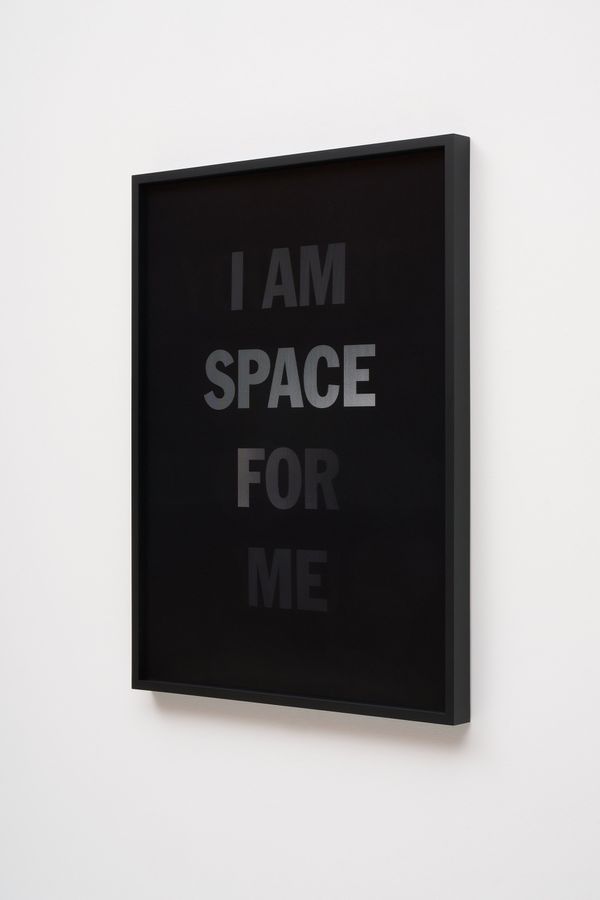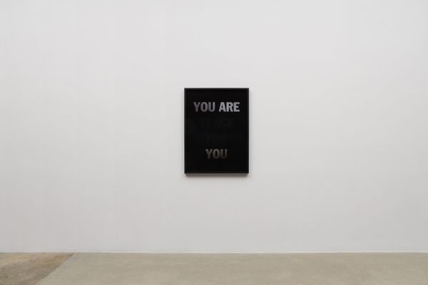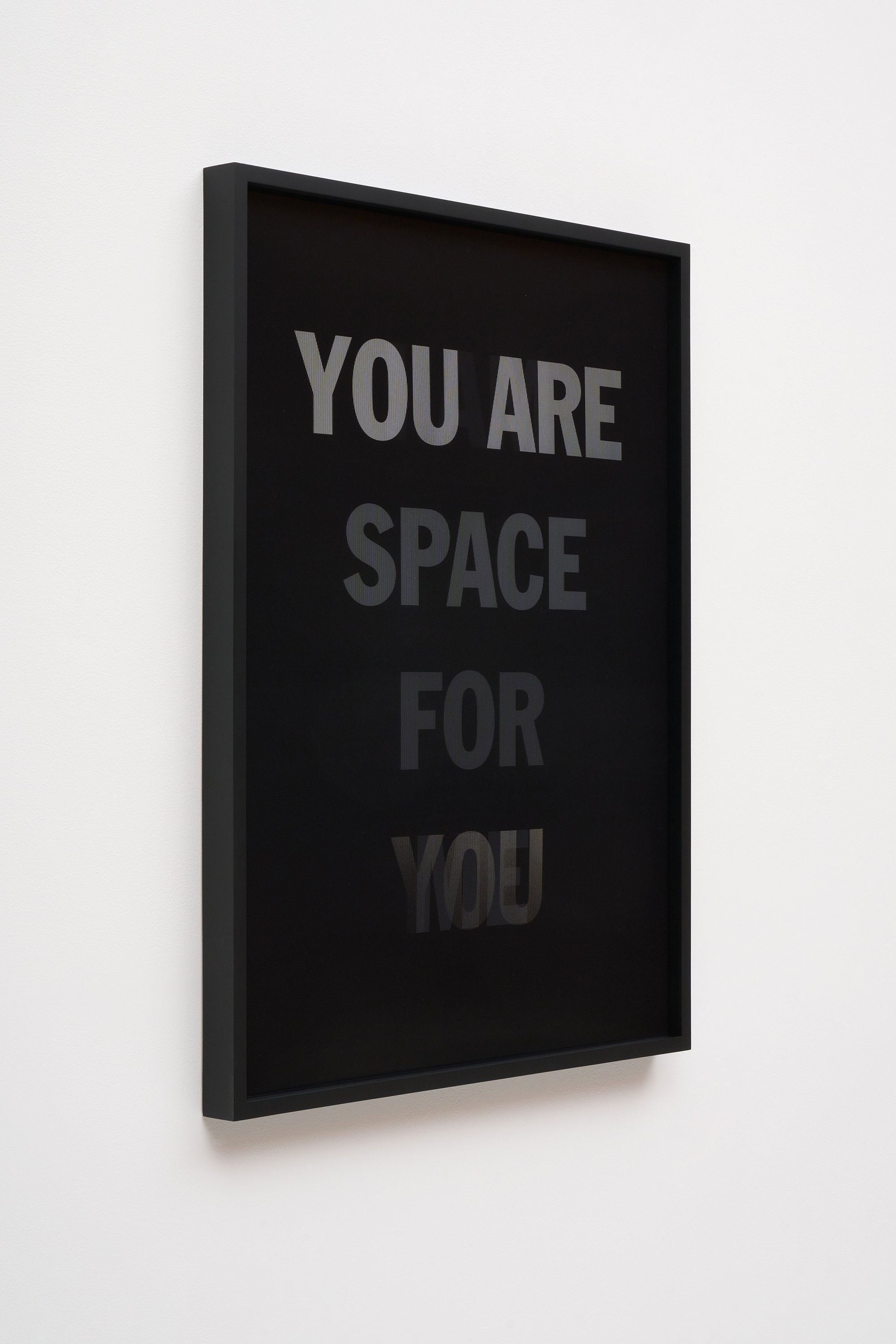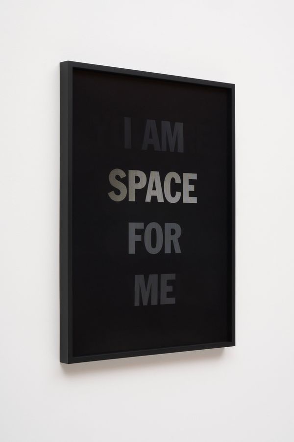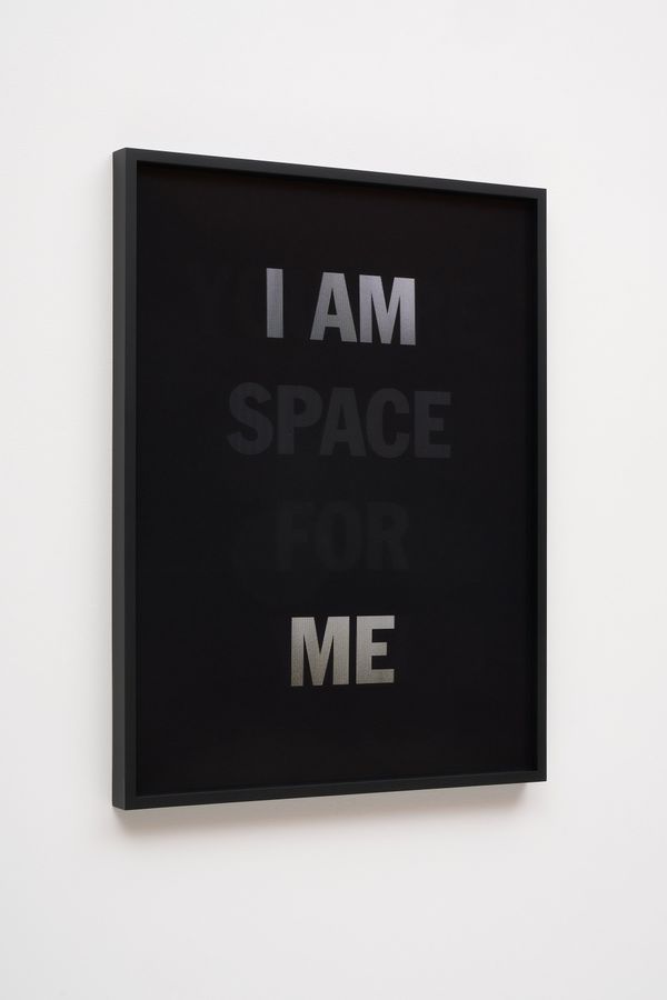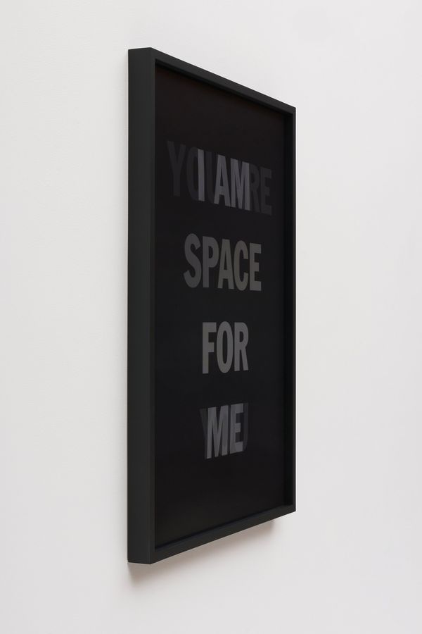 He incorporates text as a direct means of communication between himself and the viewer. The work is also expressed in monochrome. As the viewer passes in front of the material, the colour and the text move in gradients of black and white.