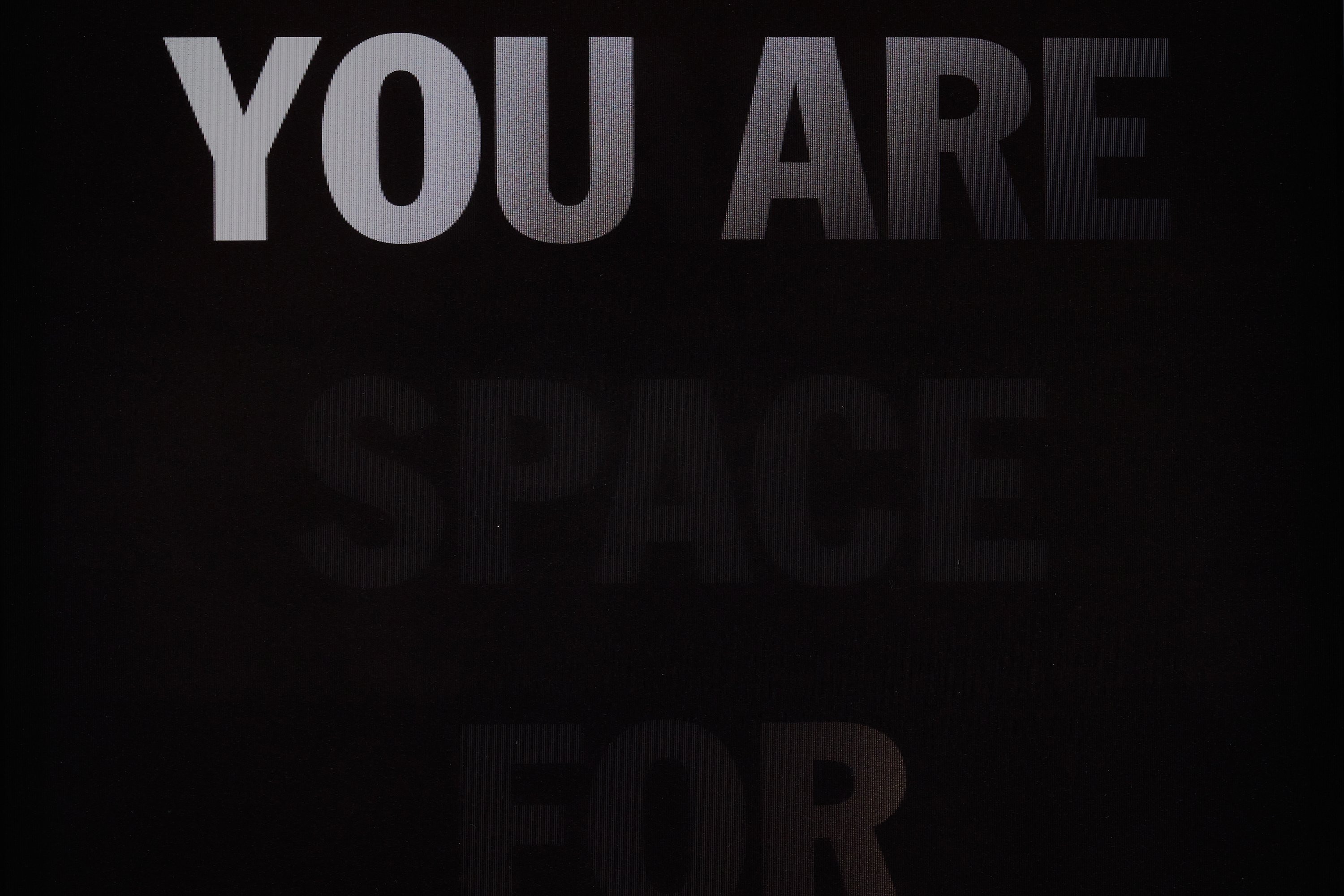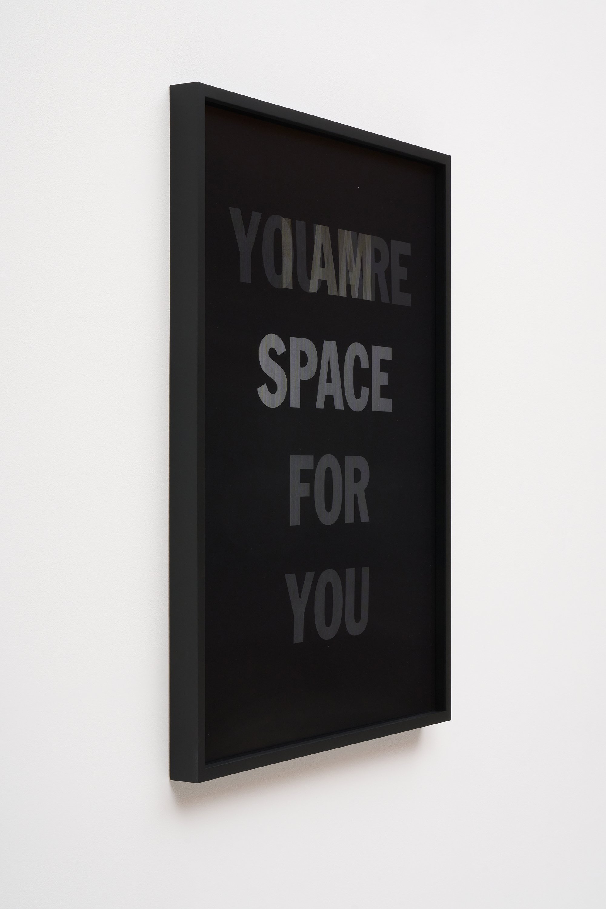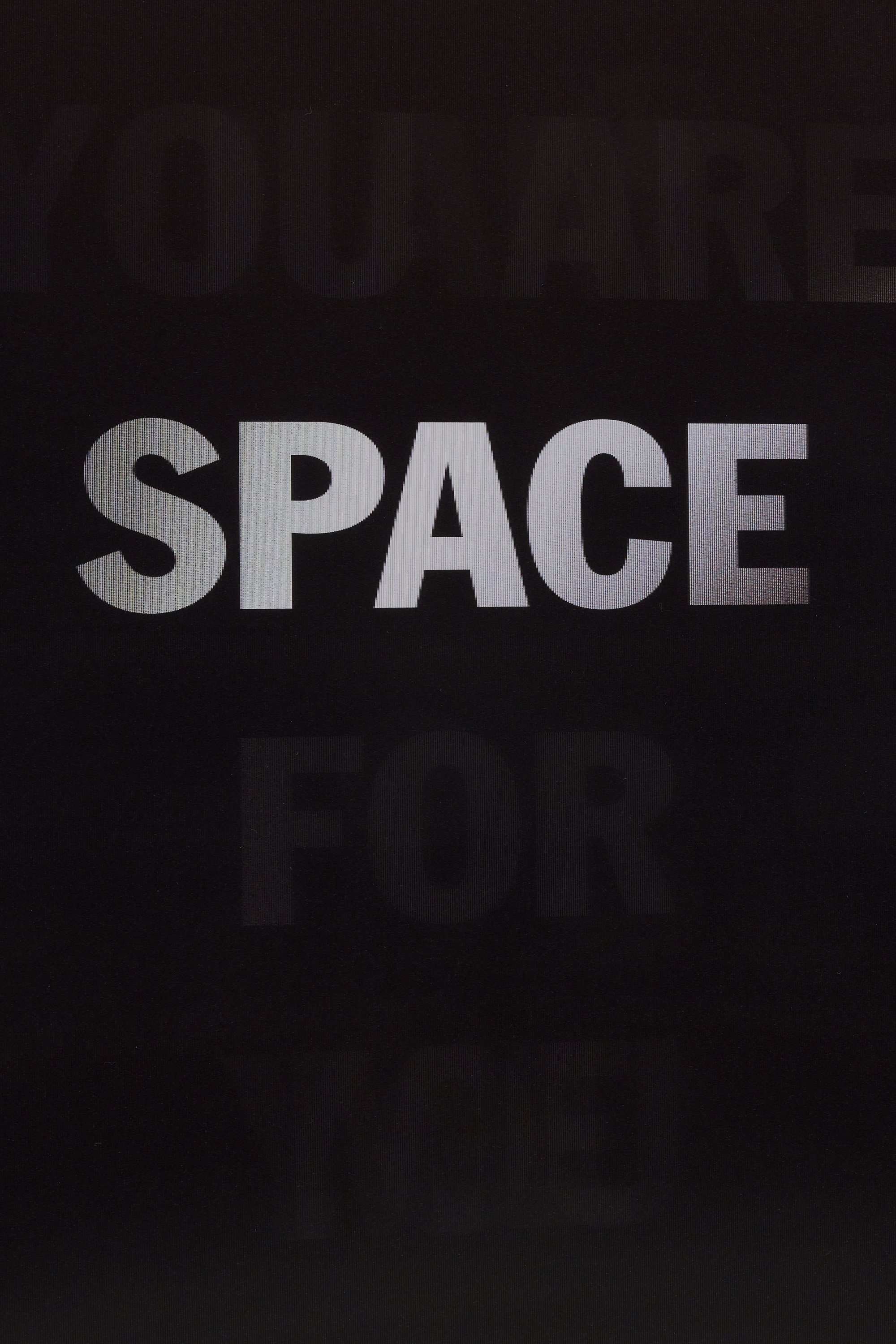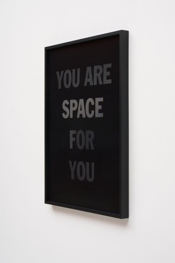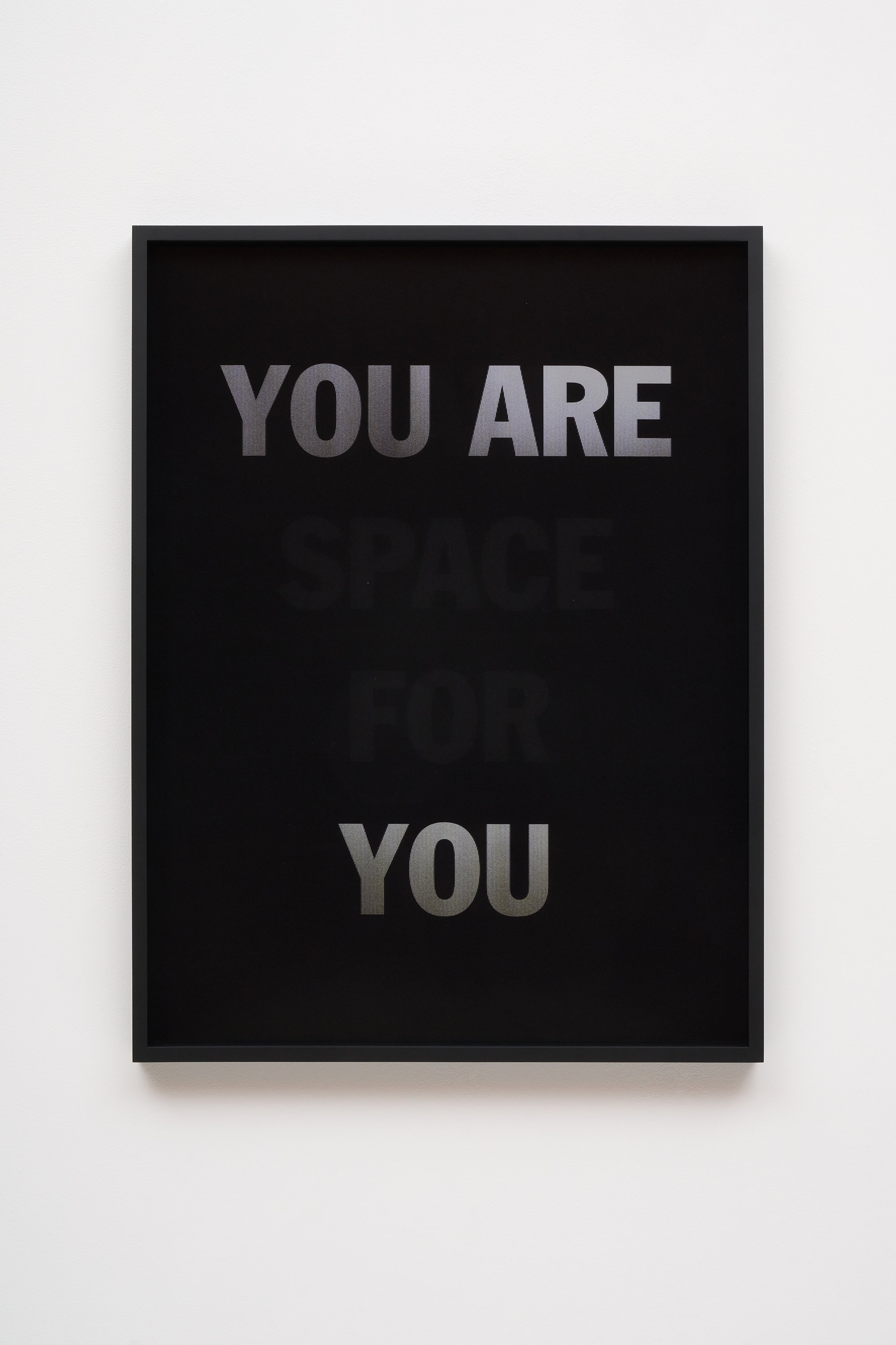 He incorporates text as a direct means of communication between himself and the viewer. The work is also expressed in monochrome. As the viewer passes in front of the material, the colour and the text move in gradients of black and white.