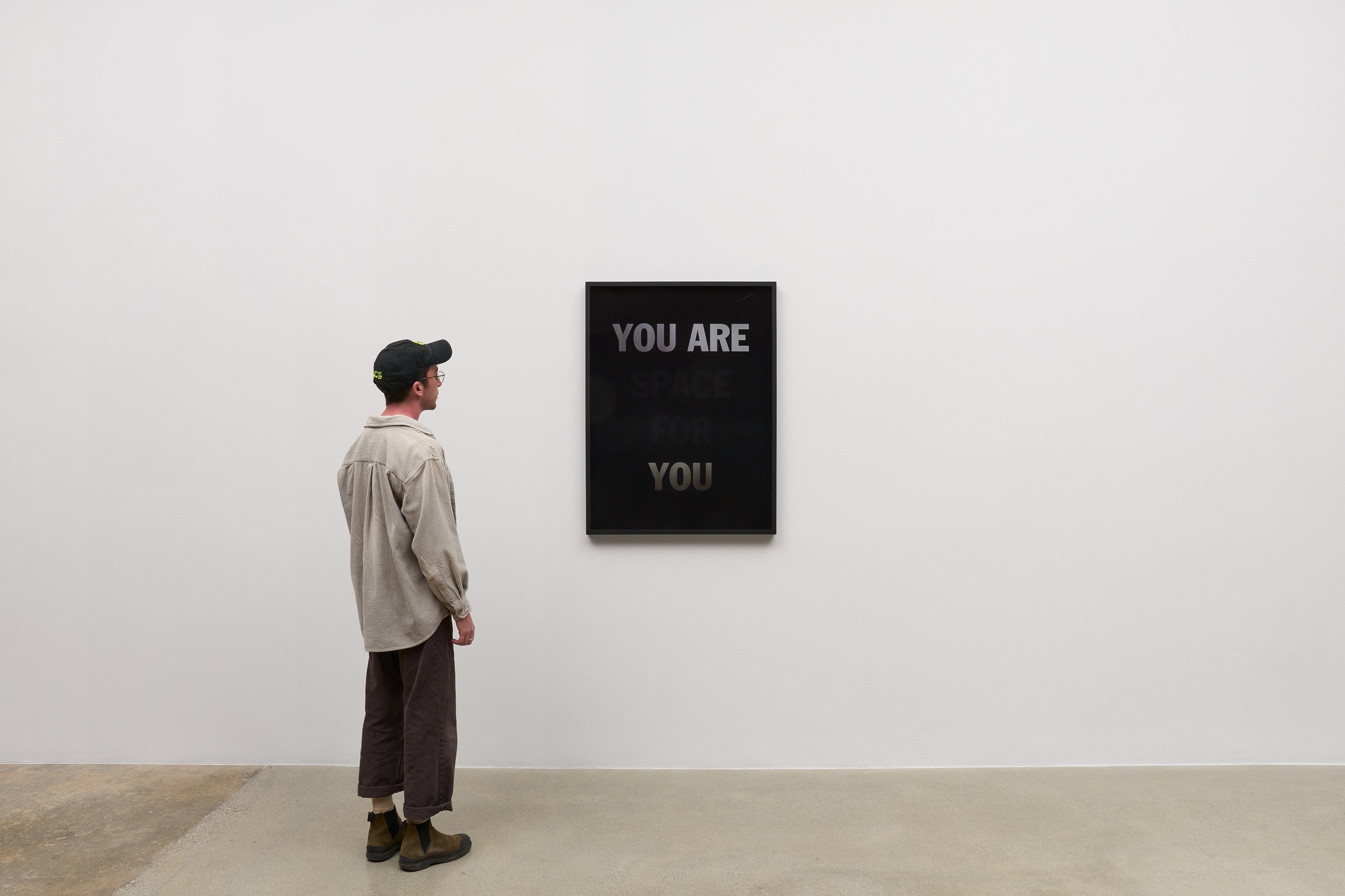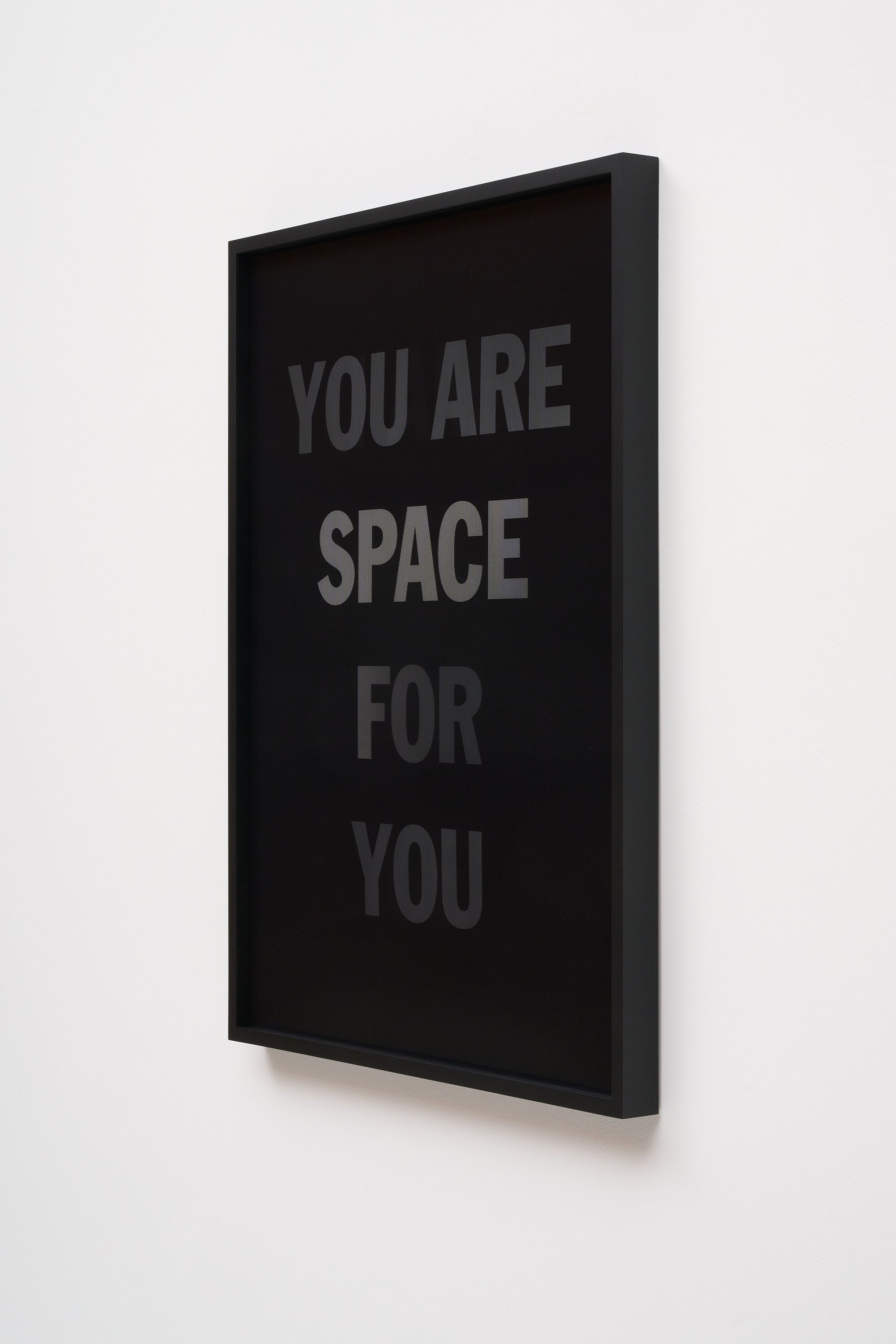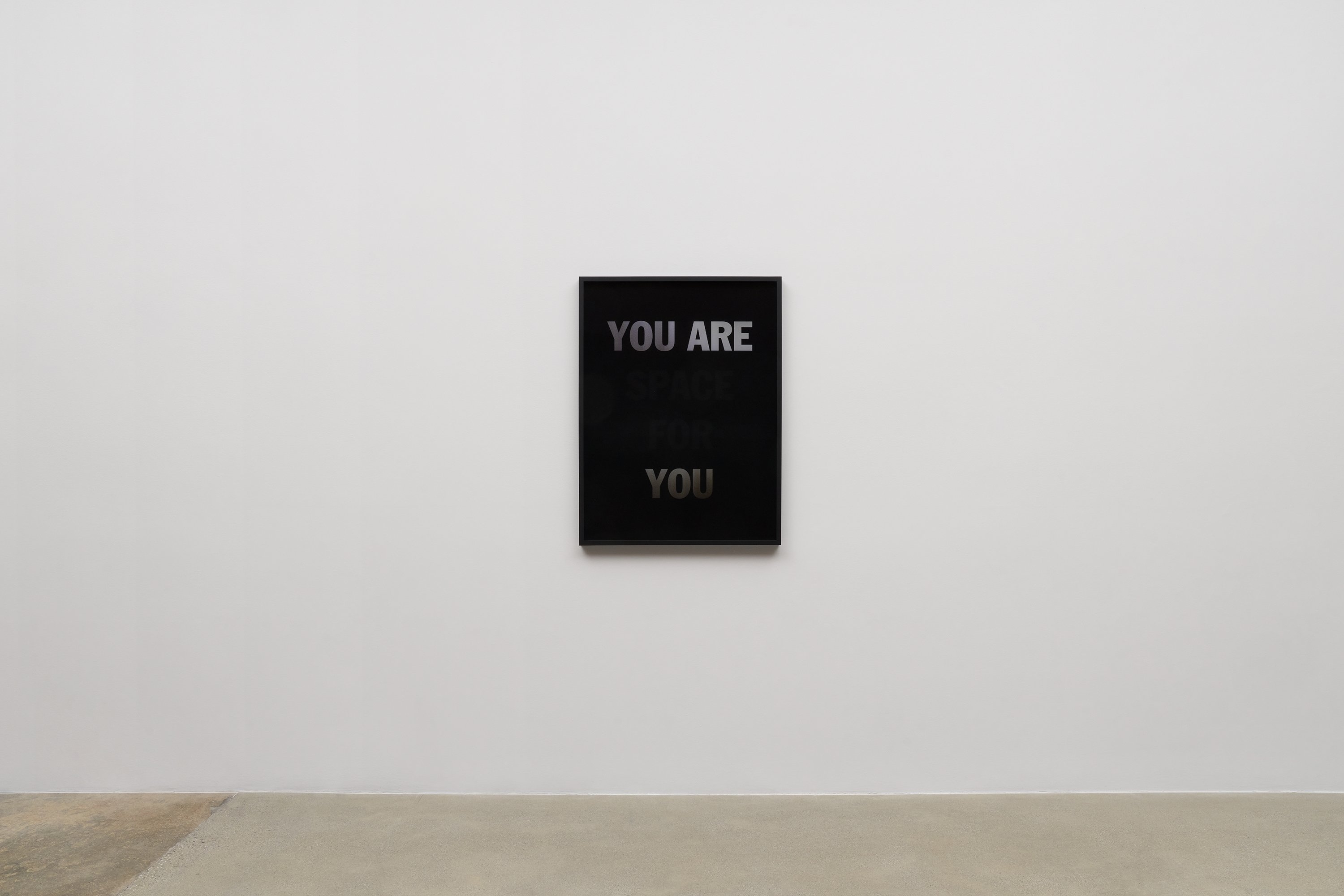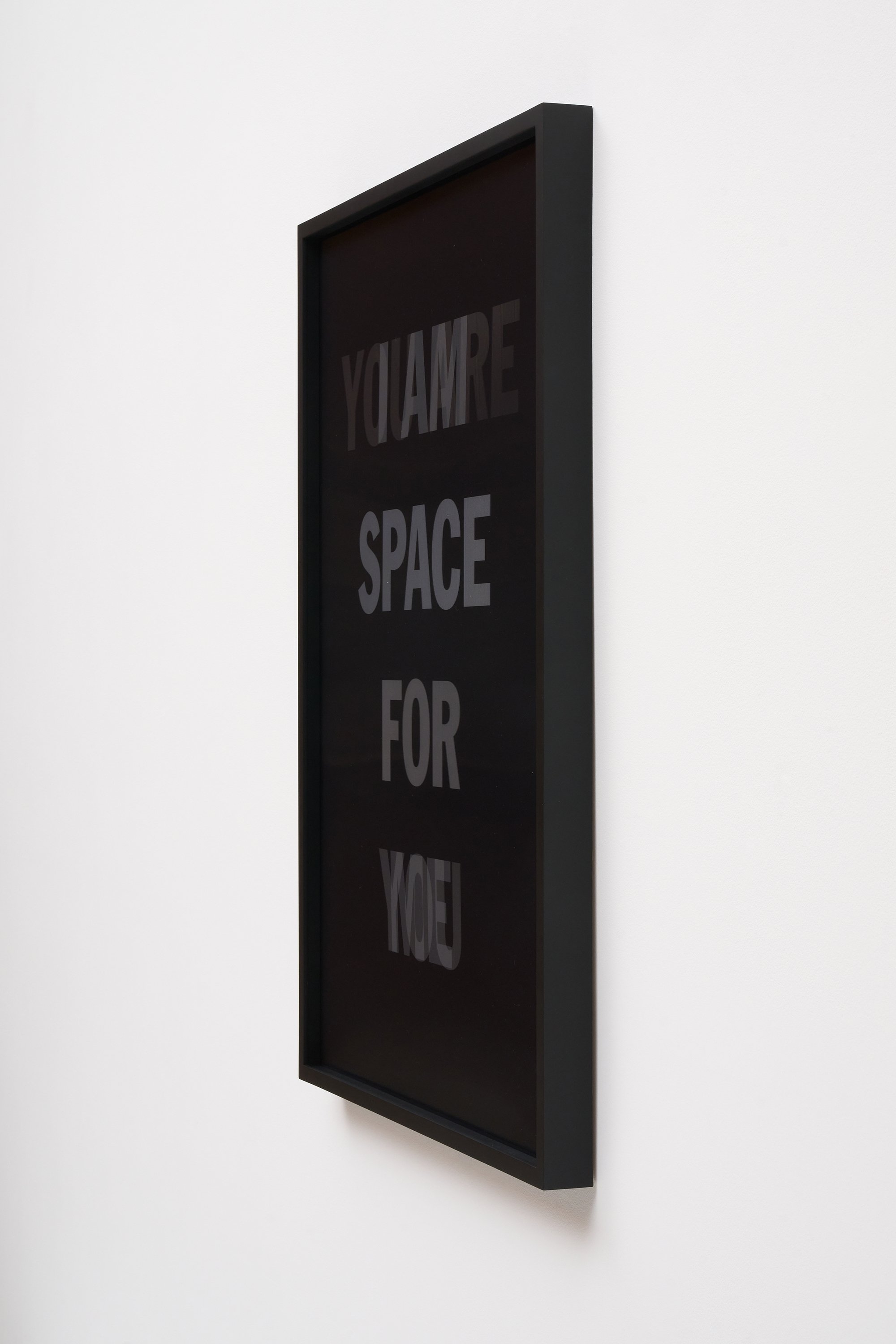 He incorporates text as a direct means of communication between himself and the viewer. The work is also expressed in monochrome. As the viewer passes in front of the material, the colour and the text move in gradients of black and white.