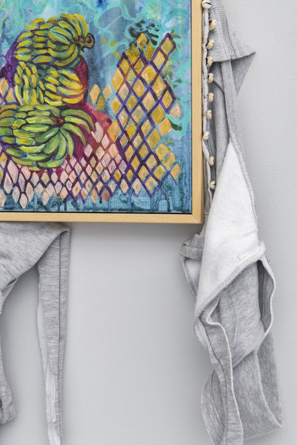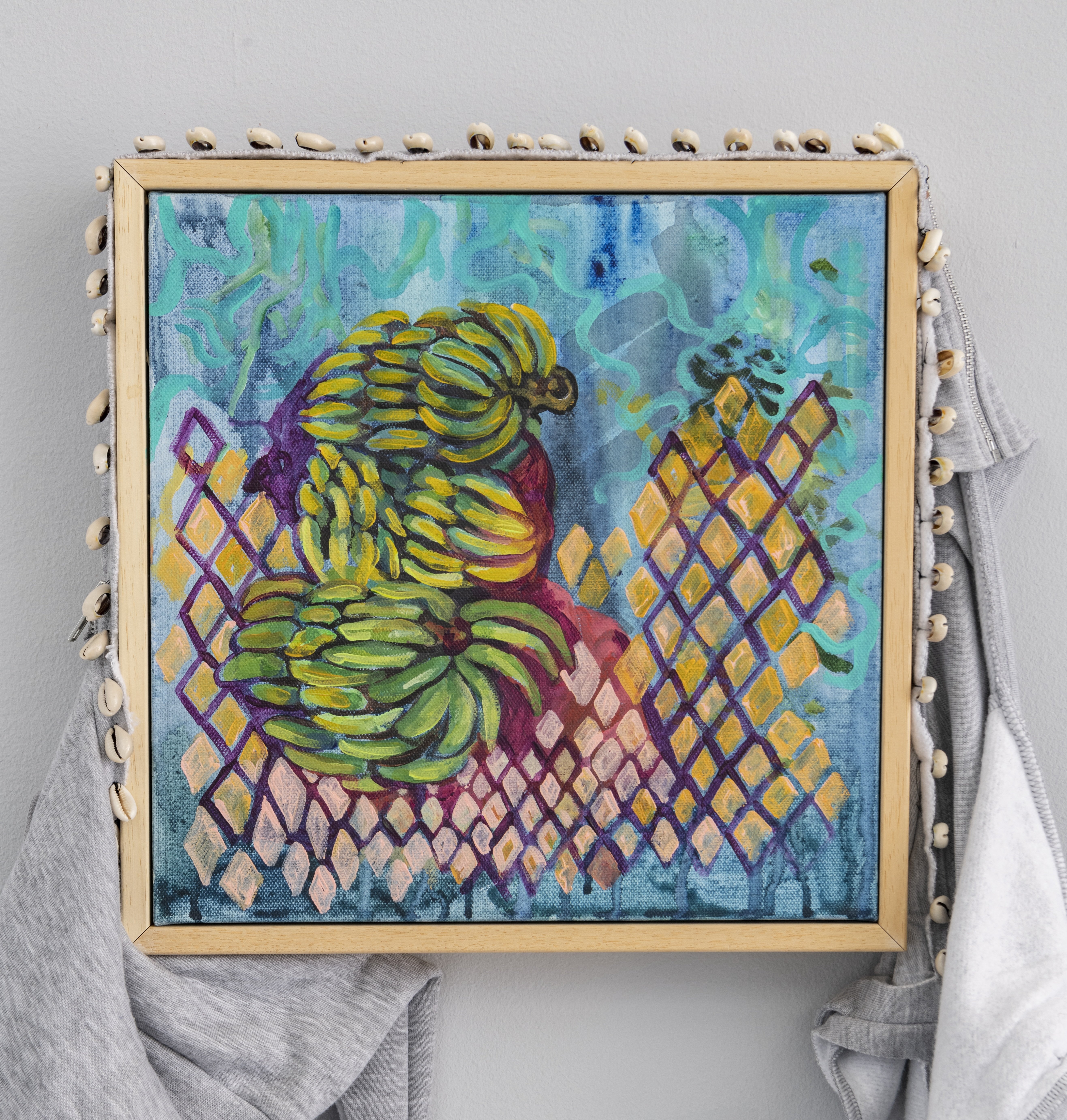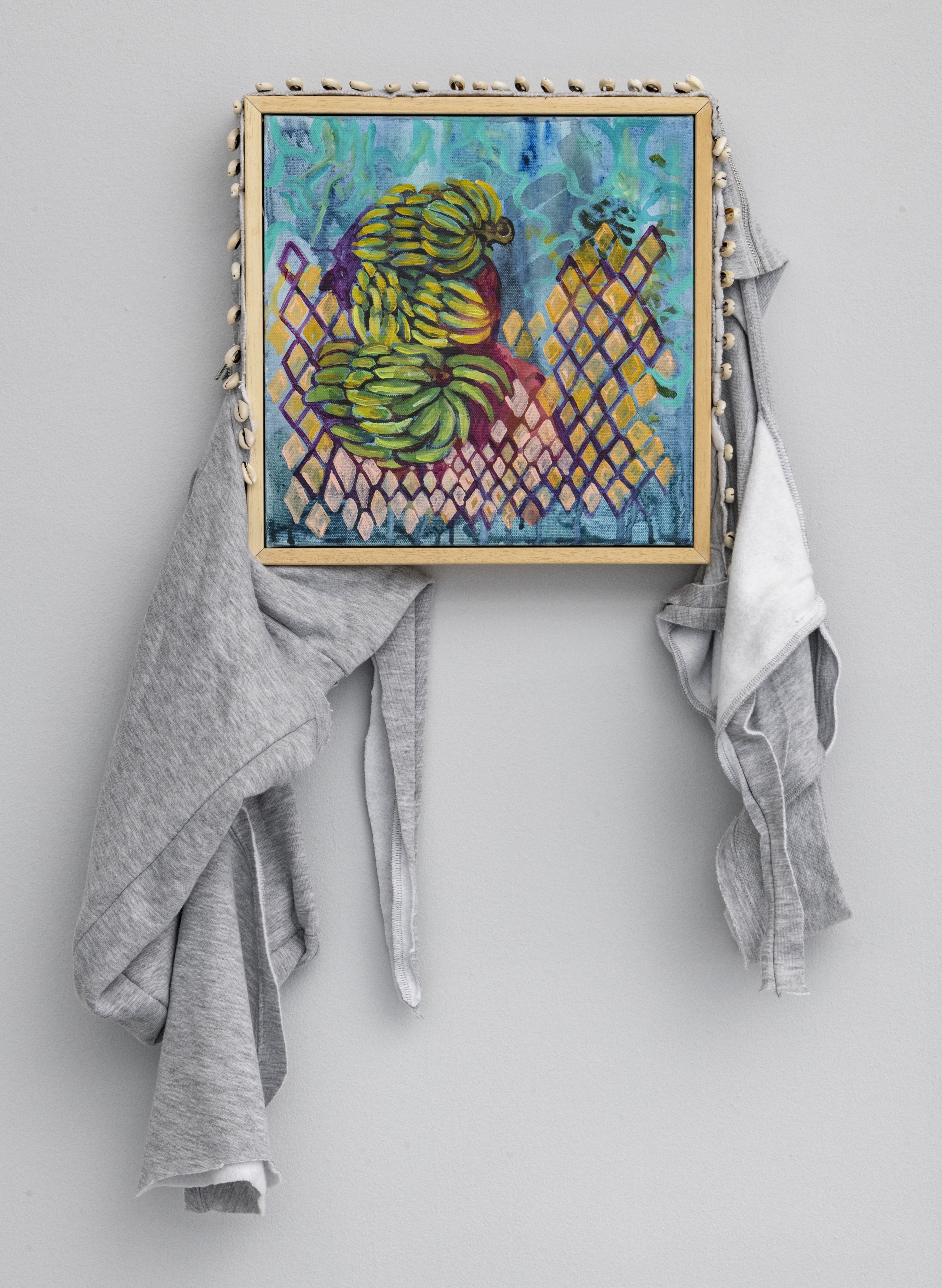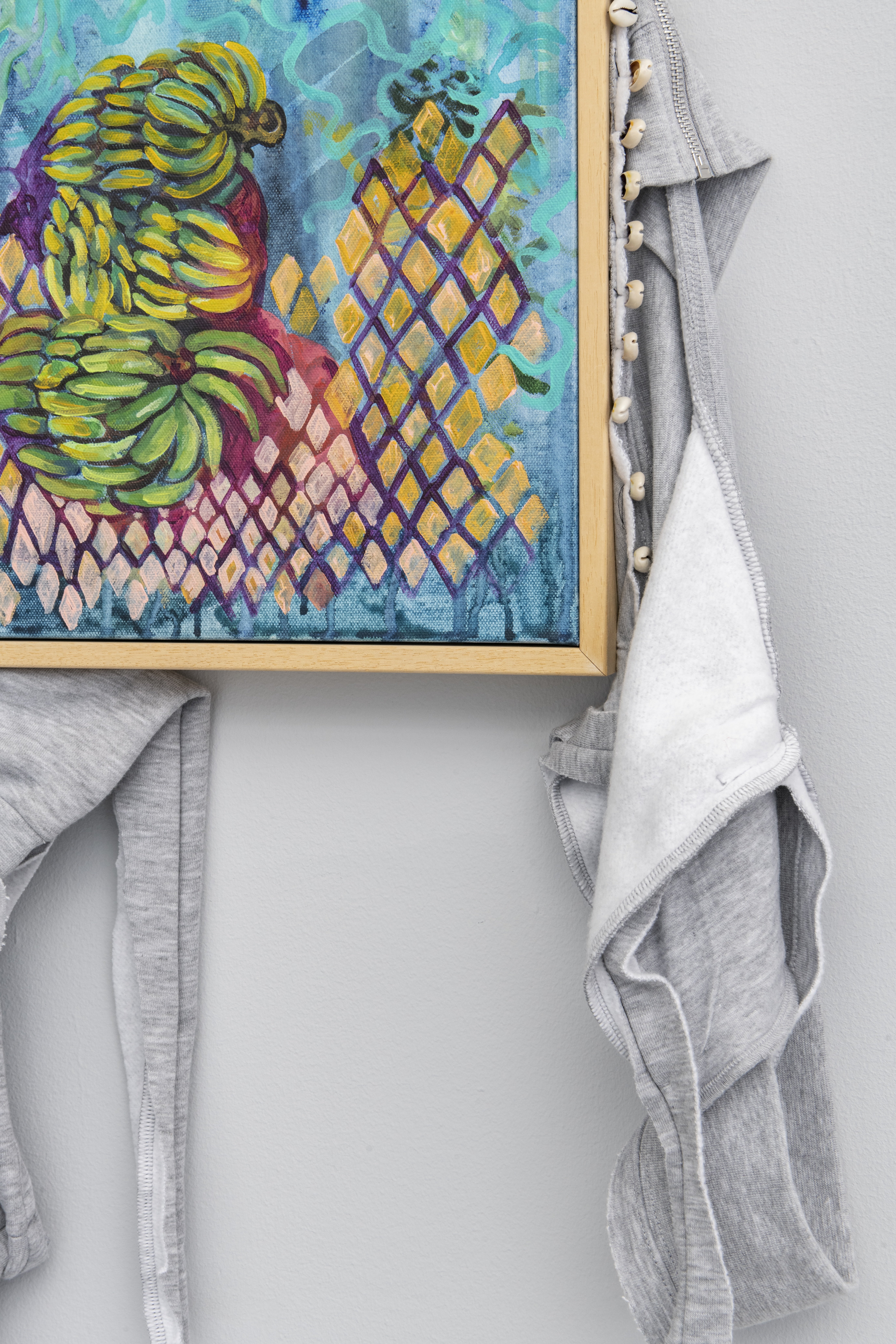 Acrylic, cloth hoodie and cowrie shells on canvas